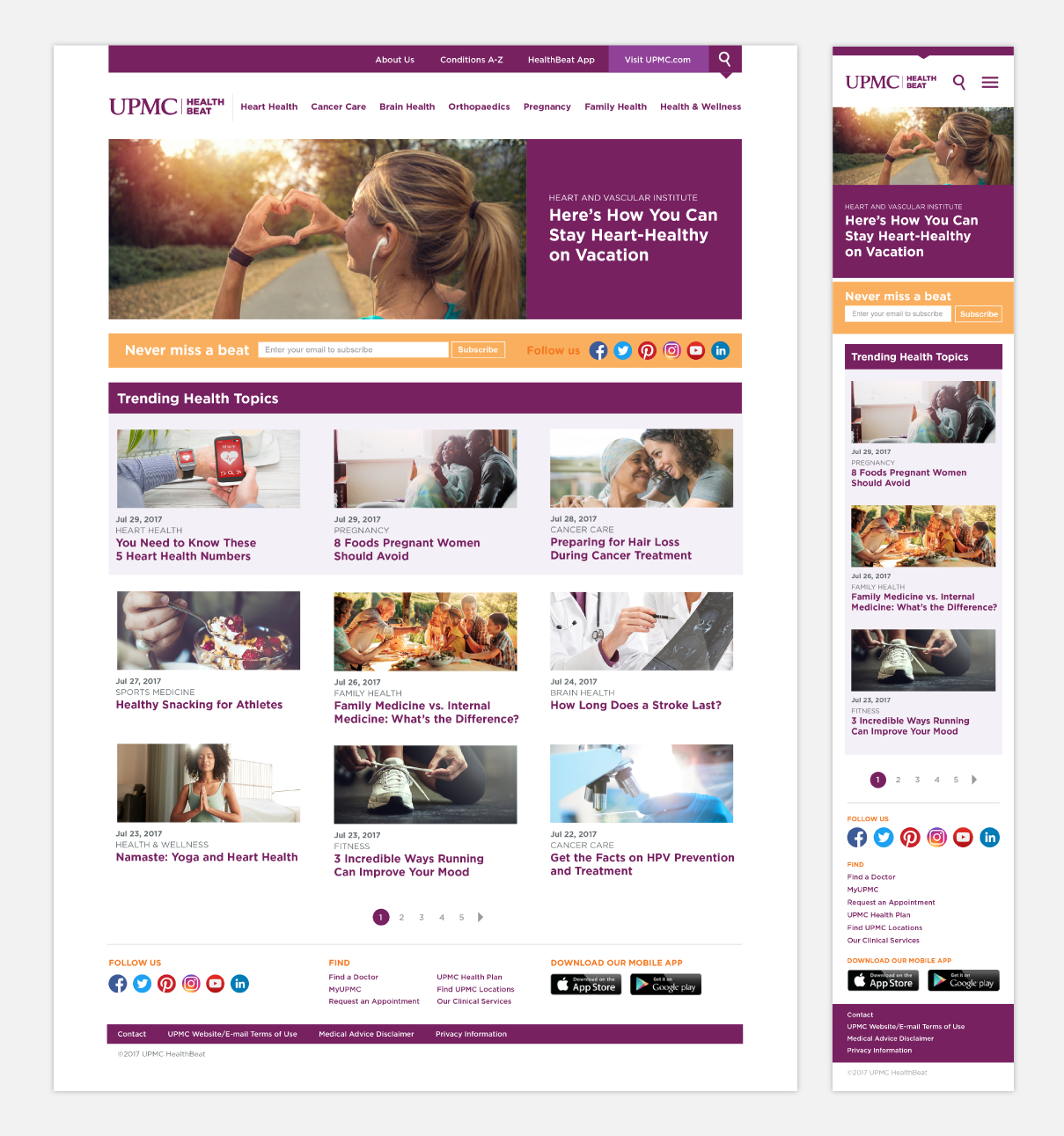 GDUSA 2017 Award winning desktop and mobile versions of the UPMC Health Beat blog interface designed closely with UX team. The design was a contributing factor to the milestone of 3M+ sessions for 2017 as of September. Mobile friendly version includes a fixed header, drop down secondary navigation from the top, hamburger menu for main navigation items, as well as a search that allows users to quickly find topics of interest. Desktop version also features a fixed header and drop down search box. All pages of site designed with UX/UI and SEO best practices.