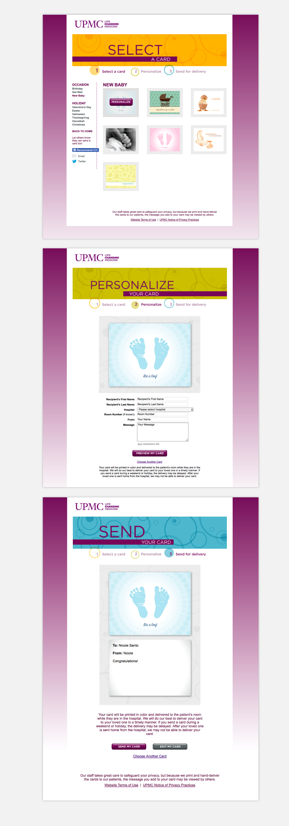 UPMC Ecards interface designed to be bright and cheerful for family and friends wishing to send a free hand-delivered card to a loved one in one of UPMC’s hospitals. Worked with tech team, hospital facilities, and the patient experience team to develop the the most feasible print and delivery process possible while trying to maintain quality assurance for the recipient. Designed over 60 cards to launch the site with. Hundreds of cards are sent on a daily basis to patients throughout the system. The site has been recommended over 50K times on Facebook.